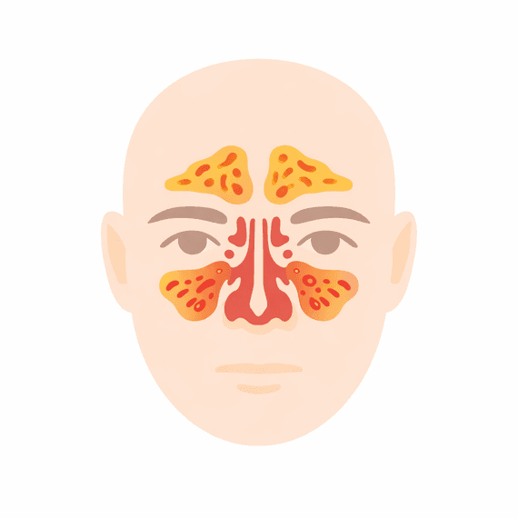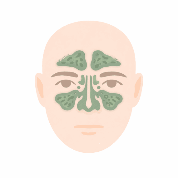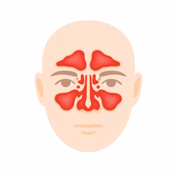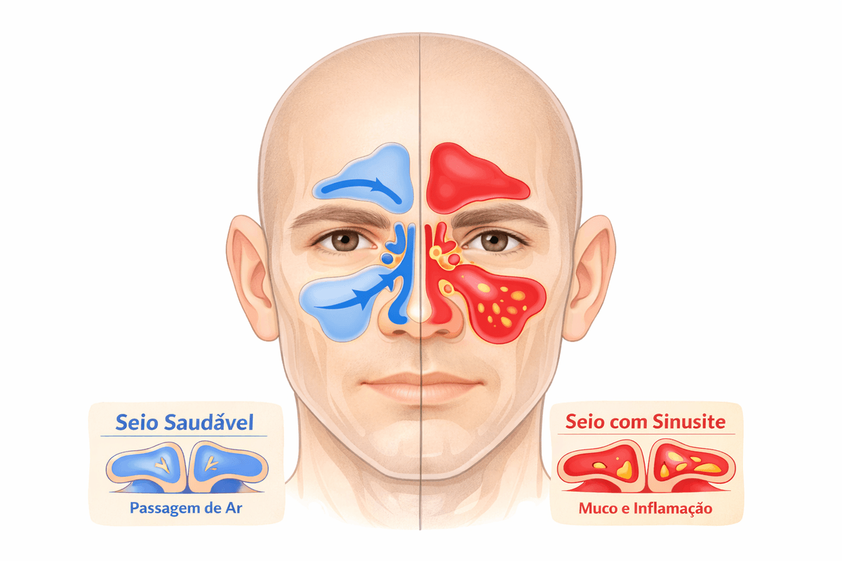 A sinusite ocorre quando os seios da face (cavidades ao redor do nariz, olhos e testa) ficam inflamados e o muco não consegue drenar adequadamente. Dessa forma, forma-se um inchaço da mucosa, aumento da produção de secreção e obstrução das vias. Esse acúmulo cria um ambiente favorável à inflamação e à proliferação de microrganismos, o que explica sintomas como dor facial, pressão e congestão nasal.